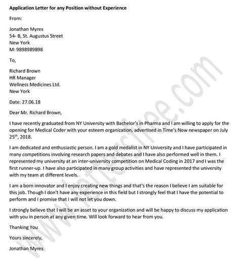 Simple Application Letter Sample For Any Position Without Experience . Learn how to write a cover letter with no experience and prove it to your next boss. Applying for a position when you have no work experience can be challenging, especially when you need to write a cover letter.